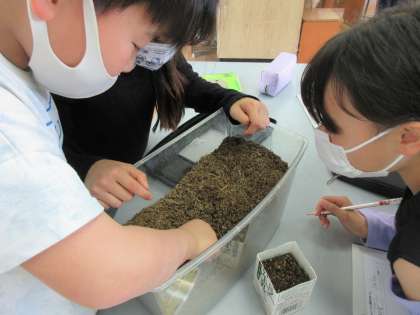 春の生物のようすを観察しています。カブトムシの幼虫はどのような大きさか,どんな形かなどよく見て観察カードにまとめました。