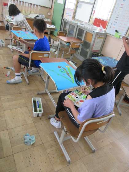 自分で考えた種からまぼろしの花が咲いた様子を描きました。カラフルでいろいろな形の花が咲いていました。みんなの作品を鑑賞するのが楽しみです。