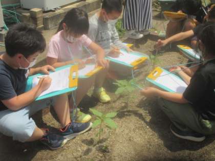 今日の理科の学習は,ヒマワリとホウセンカがどのくらい成長したのか観察しました!