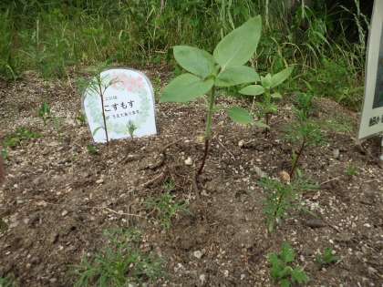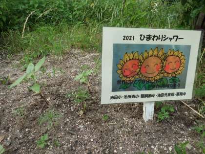 5月にいきもの委員会でひまわりの種をまきました。今,ひまわりの芽が出て20cm位まで育ってきました。コスモスの苗を頂いたので,ひまわりの周りに植えました。夏にはひまわり!秋にはコスモスの花!咲くのが楽しみです。