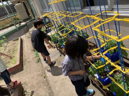 つるが伸びてきたので,アサガオに支柱を立てました!