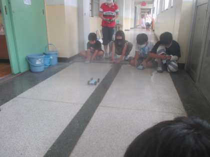 今日はゴムの力で走る車を作り,みんなで走らせてみました。