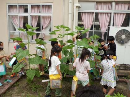 ひまわりは子どもたちの背よりもすごく大きく育っていました!