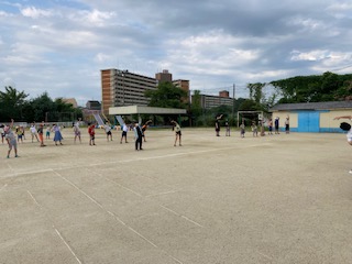今日と明日,学校の運動場でPTAの方々にお世話になってラジオ体操をします。