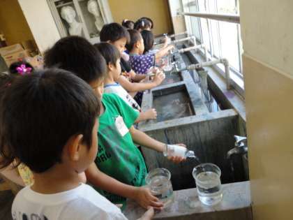 友達と相談しながらいろんな方法で水のかさを比べていました。