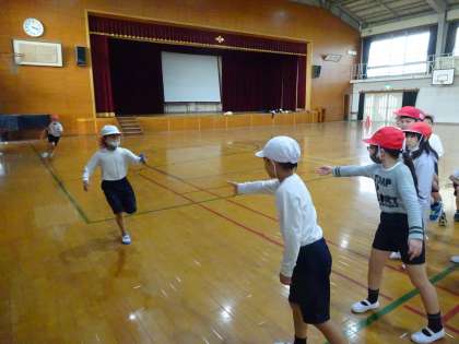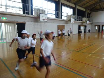 昨日はお天気が悪く,今日は雨上がりで地面に水たまりが残っていたので,体育の学習は体育館で持久走をしたり,リレーをしたりしました!