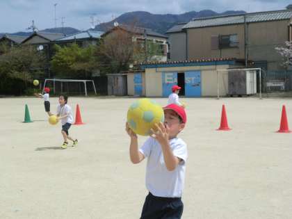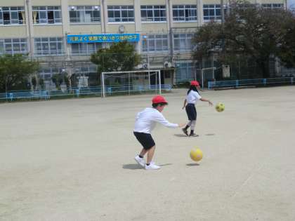 「ふえおに」で広い運動場いっぱいを走り回ったり,ボールを使った運動を楽しんだりと体をほぐす運動をしました。