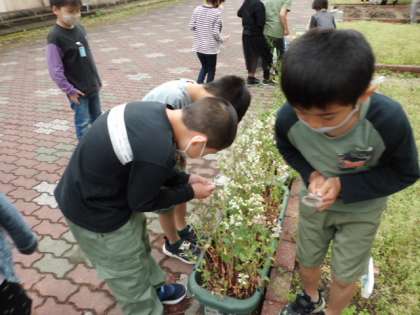 教室で使い方と注意することを確かめて,中庭に咲いているアブラナやダイコンなどを観察しました。