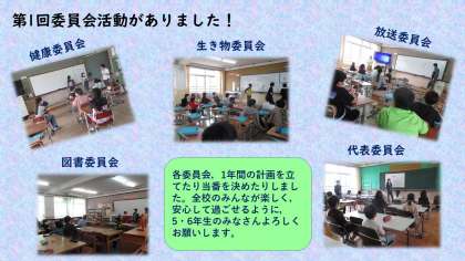 今日,第1回目の委員会活動がありました。5年生にとっては,初めての委員会活動です。6年生とは違い,少し緊張した姿が印象的でした。5・6年生の皆さん,全校のみんなが楽しく安全に過ごすことができるよう,1年間よろしくお願いします。