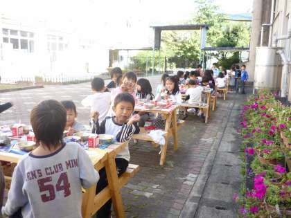 中庭で,一年生全員給食をいただきました。