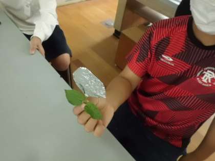 今日は,ヨウ素液を使って,でんぷんを確かめたり,ジャガイモの葉に日光を当てないようにアルミホイルをつける練習をしました。