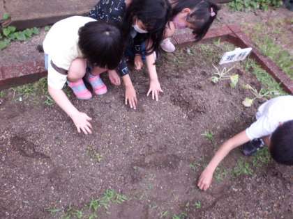 ホウセンカ,オクラ,ダイズ,ヒマワリの種を畑に植えました。