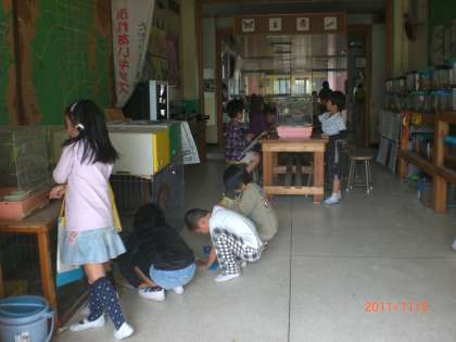 池田小学校にいる生き物をじっくり観察,五感をフル活用してスケッチをしています。
