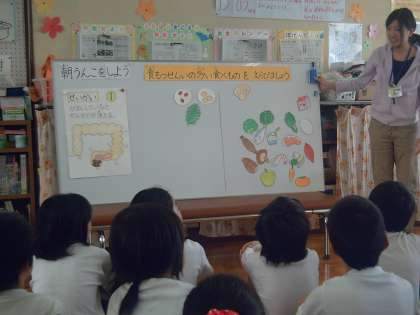 体重測定前の保健指導で「食物せんいを多く含む食べもの選び」をしました。みんなとても真剣に考えていました。