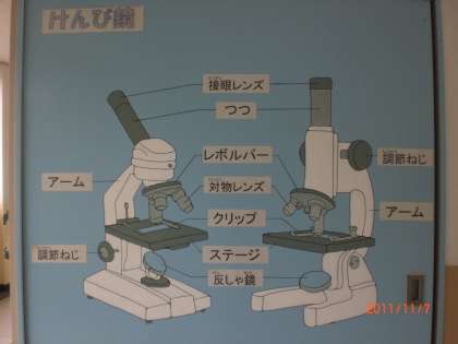 理科の学習に役立つように防火扉を利用して顕微鏡とアサガオの花のつくりをペイントしました。