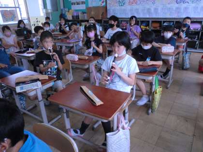 持ち方や姿勢,穴のふさぎ方などを確認し,やさしく息を入れてみました。