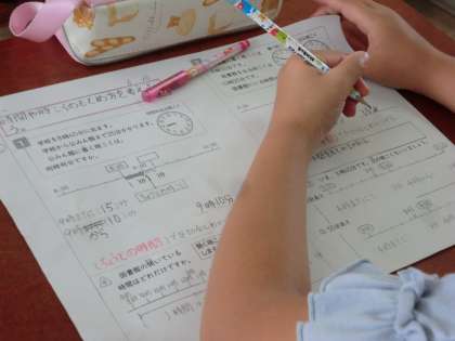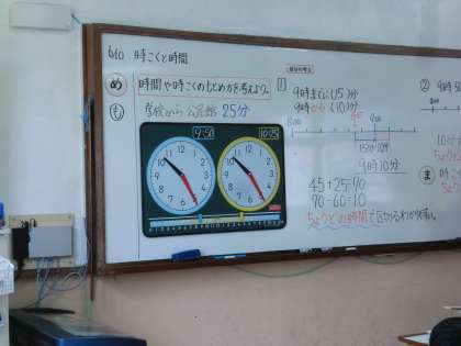 何時何分のことを「時こく」,時こくと時こくの間を「時間」ということを再確認して問題に取り組んでいます。