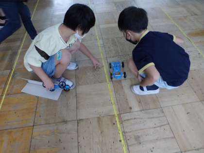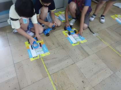 輪ゴムを伸ばし方を変えて,車の動く距離の違いを調べました。