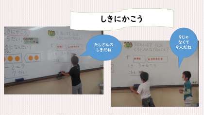 算数科「たしざん1」の学習に慣れてきて,答えのかき方を考えたり,自分の考えをみんなに発表したりすることができるようになってきました。