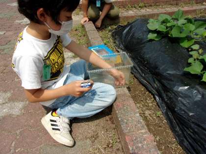 小石で陸を作ったり,えさを準備したりと,楽しみながらお世話をする姿が見られます。