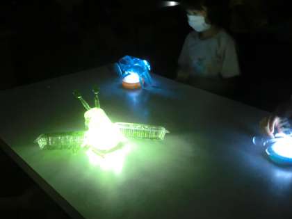 ペットボトルやプリンカップなどの光を通す素材の空き容器で作ったオリジナルの生き物や動物たちに光を当てて鑑賞会をしました。