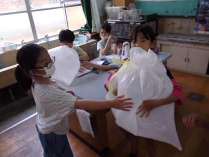 空気や水を閉じ込めて,圧した時の様子を観察しましたが,言葉で表してみると意外と表しにくく,言葉を選んで話し合っていました。