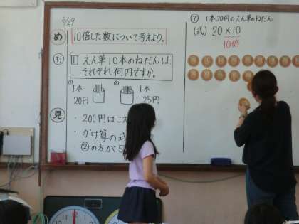 10倍したら位が一つ上がるので,みぎはしに「0」を書けば答えになることを確認しました。