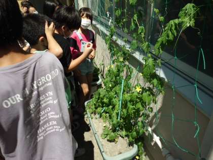 ツルレイシの茎も伸びて葉も多くなり,黄色い花が咲き始めました。