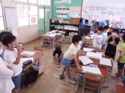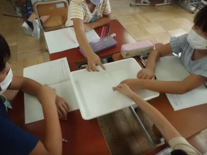 輪ゴムをはじいて、音が出ているものは震えていることを確かめました。