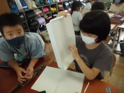 その後で、糸電話にもう1本の糸をつないでも声が伝わるか調べました。