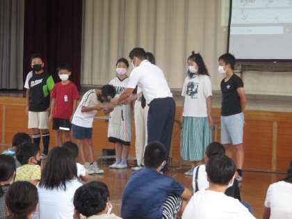 校長先生のお話の後、タグラグビー部の表彰がありました。京都で3位という素晴らしい成績でした。