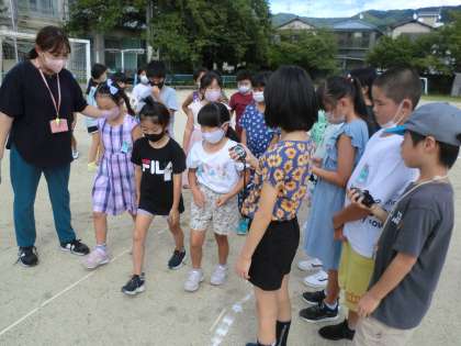 今日の算数では、実際に100mを歩いて何秒かかるかを測りました。