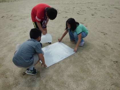 そこで、今日は、平らに見える運動場にも坂になっているところがあるのかを、水を流して確かめました。