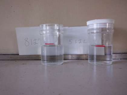 ふたをしていた方の水位は、まったく減っていないのに、ふたをしていなかった方の水位は、目印のテープより下になっていました。