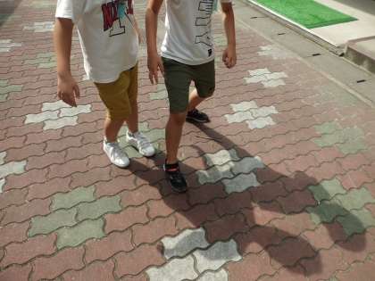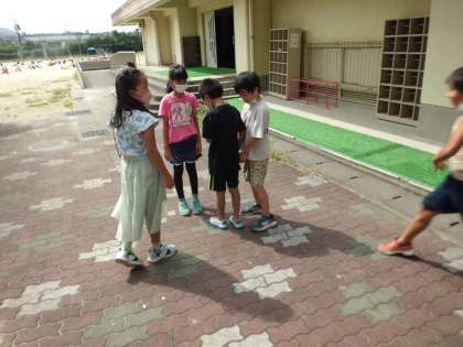 地面のようすはどんなだろうと話し合って、明るい、白っぽい、広いなどと、さらに影ができているとの考えも出たので、かげ踏み遊びをして確かめました。