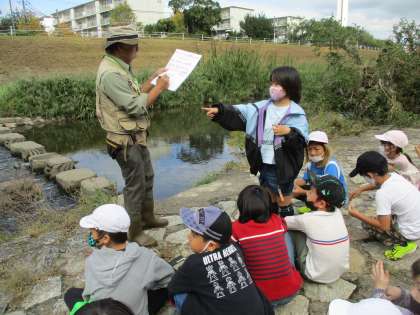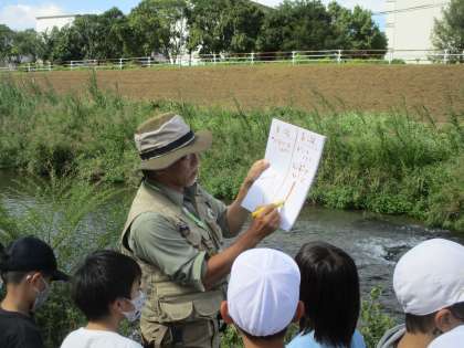 講師の河合先生からチョウセンカマキリやサギなど、山科川に住む生き物の話をたくさん聞かせていただきました。