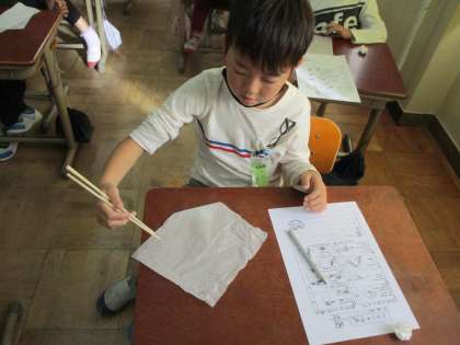 持ち上げる、裏返す、開けるなど、正しいお箸の持ち方で挑戦してみたのですが、中々苦戦していました。