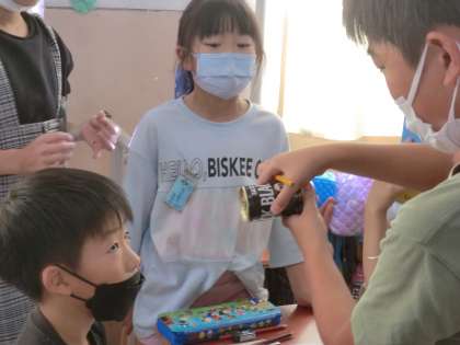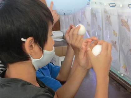 ボール、風船、卵、缶など実物を上から見たり真横から見たりしてどんな形に見えるかを確認しました。
