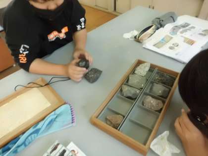 その後、火山でできた石の標本をルーペで見て粒の形に注意して観察しました。