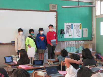 どのグループもロイロノートを使って資料を見せたり、ポスターや手作りの紙芝居を見せたりしながら発表することができていました。