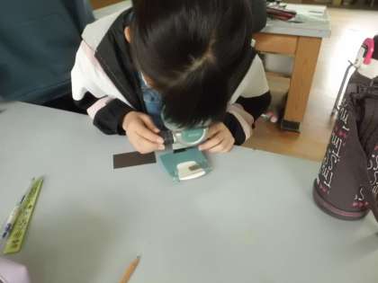 身近に火山がないこともあり、今一つ興味がわかないようでしたが、火山灰のプレパラートを顕微鏡で見ることには興味をもって取り組み、ガラスのようなかけらや黒いかけらがあることを見つけていました。