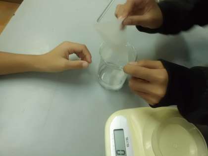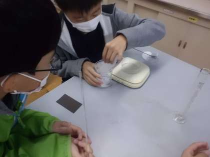 ミョウバンを電子てんびんで5gずつ計って、50mlの水に、5gは溶けるけど、10gまでは溶けきらないことを確かめることができていました。