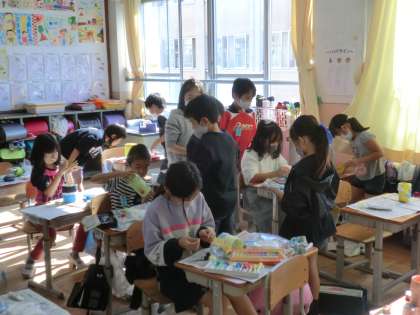途中で友だちの作品を見る時間を挟み、粘土ののばし方や、色の交ぜ具合など互いに参考にしました。