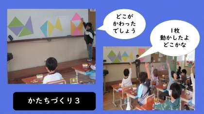 今回は、三角形を組み合わせていろいろな形を作った後、三角形を1枚移動させて違う形にかえる学習です。