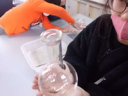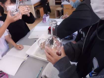 フラスコにせっけん水で膜をはり、手で温めてみました。