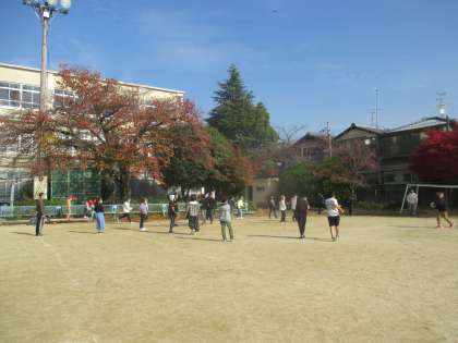 青空の下、広い運動場でいろいろな学年が一緒に仲良く遊んでいます。