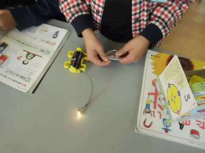 乾電池と豆電球で回路を作り、回路の途中にものを挟んで、電気が通るかどうかを調べました。
