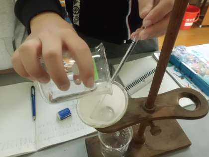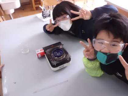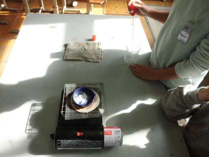 安全のため防護メガネをして、水をコンロで熱して蒸発させました。