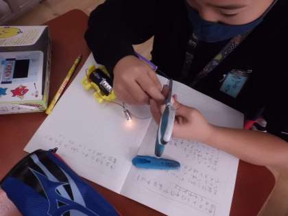 金属は電気を通して、プラスチックは電気を通さないことを確かめました。
