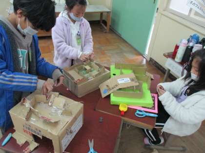 生活科の「あそんでためしてくふうして」では、うごくおもちゃを使った遊び方を考えています。
